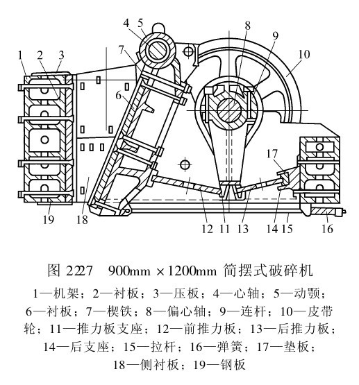 1.機(jī)架 機(jī)架是上下開口的四壁剛性框架,用作支撐偏心軸并承受破碎物料的反作用力,要求有足夠的強(qiáng)度和剛度,一般用鑄鋼整體鑄造,小型機(jī)也可用優(yōu)質(zhì)鑄鐵代替鑄鋼。大型機(jī)的機(jī)架需分段鑄成,再用螺栓牢固鏈接成整體,鑄造工藝復(fù)雜。自制小型顎式破碎機(jī)的機(jī)架也可用厚鋼板焊接而成,但剛度較差。 2.顎板和側(cè)護(hù)板 定顎和動顎都由顎床和顎板組成,顎板是工作部分,用螺栓和楔鐵固定在顎床上。定顎的顎床就是機(jī)架前壁,動顎顎床懸掛在周上,要有足夠的強(qiáng)度和剛度,以承受破碎反力,因而大多是鑄鋼或鑄鐵件。 3.傳動件 偏心軸是破碎機(jī)的主軸,受有巨大的彎扭力,采用高碳鋼制造。偏心部分須精加工、熱處理、軸承襯瓦用巴氏合金澆注。偏心軸一端裝帶輪,另一端裝飛輪。 4.調(diào)節(jié)裝置 調(diào)節(jié)裝置有楔塊式,墊板式和液壓式等,一般采用楔塊式,由前后兩塊楔塊組成,前楔塊可前后移動,頂住后推板;后楔塊為調(diào)節(jié)楔,可上下移動,兩楔塊的斜面倒向貼合,由螺桿使后楔塊上下移動而調(diào)節(jié)出料口大小。小型顎式破碎機(jī)的出料口調(diào)節(jié)是利用增減后推力板支座與機(jī)架之間的墊片多少來實(shí)現(xiàn)。 5.飛輪 顎式破碎機(jī)的飛輪用以存儲動顎空行程時(shí)的能量,再用于工業(yè)形成,使機(jī)械的工作符合趨于均勻。帶輪也起著飛輪的作用。飛輪常以鑄鐵或鑄鋼制造,小型機(jī)的飛輪常制成整體式。飛輪制造,安裝時(shí)要注意靜平衡。 6.潤滑裝置 偏心軸軸承通常采用集中循環(huán)潤滑。心軸和推力板的支撐面一般采用潤滑脂通過手動油槍給油。動顎的擺角很小,使心軸與軸瓦之間潤滑困難,常在軸瓦底部開若干軸向油溝,中間開一環(huán)向油槽使之連通,再用油泵強(qiáng)制注入干黃油進(jìn)行潤滑。